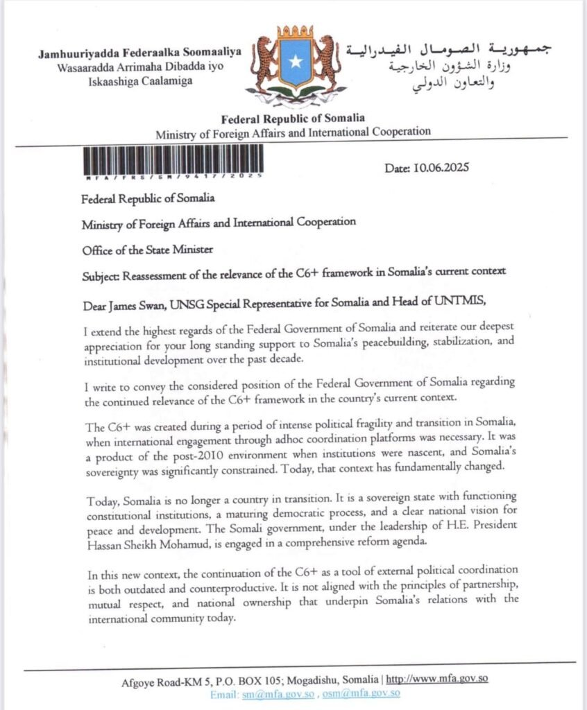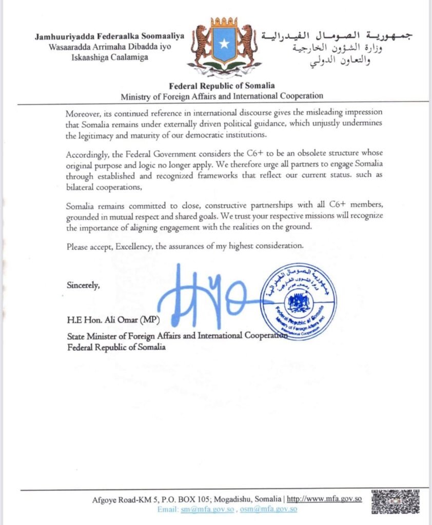 Dowladda Soomaaliya ayaa u aqoonsatay C6+ inuu yahay qaab dhismeed laga guuray oo ujeedadii markii hore loo sameeyay aysan hadda jirin, waxayna ugu baaqday saaxibadda Beesha Caalamka inay Soomaaliya kula xiriiraan qaababka la isla oggol yahay oo ay u soo maraan hey’adaha sharciga ah.